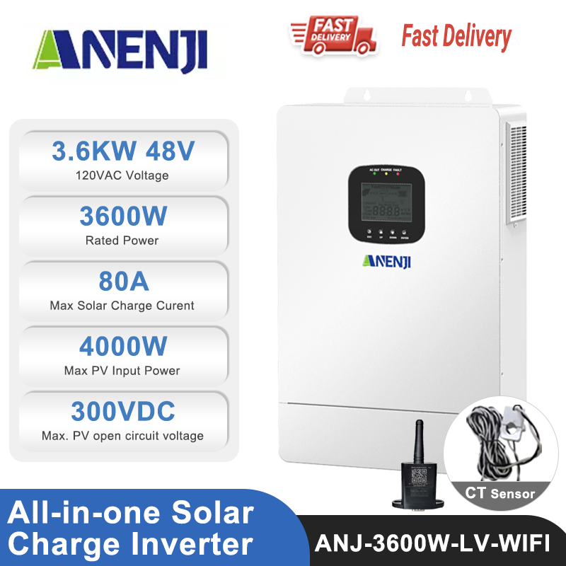 ANENJI 110Vac single-phase all-in-one solar charge inverter is designed for reliable and efficient solar energy management. It features a built-in MPPT controller with a maximum charging current of 80A and supports up to 4000W/22A PV input power. With a maximum PV open circuit voltage of 300Vdc, it ensures flexibility in system design. The inverter delivers pure sine wave output, providing stable and clean power for sensitive electronics. Certified with UL 1741 and FCC standards, it guarantees safety and compliance.