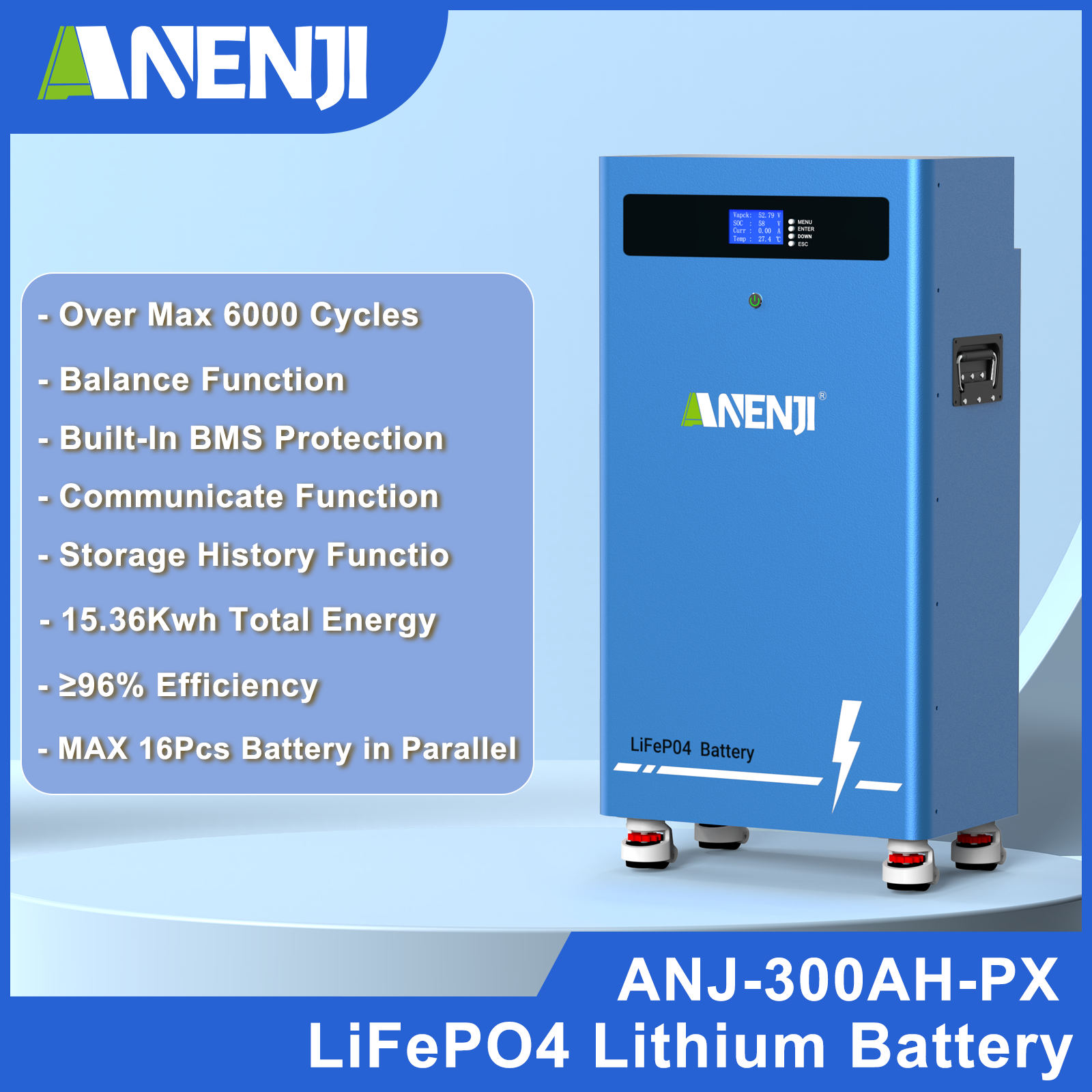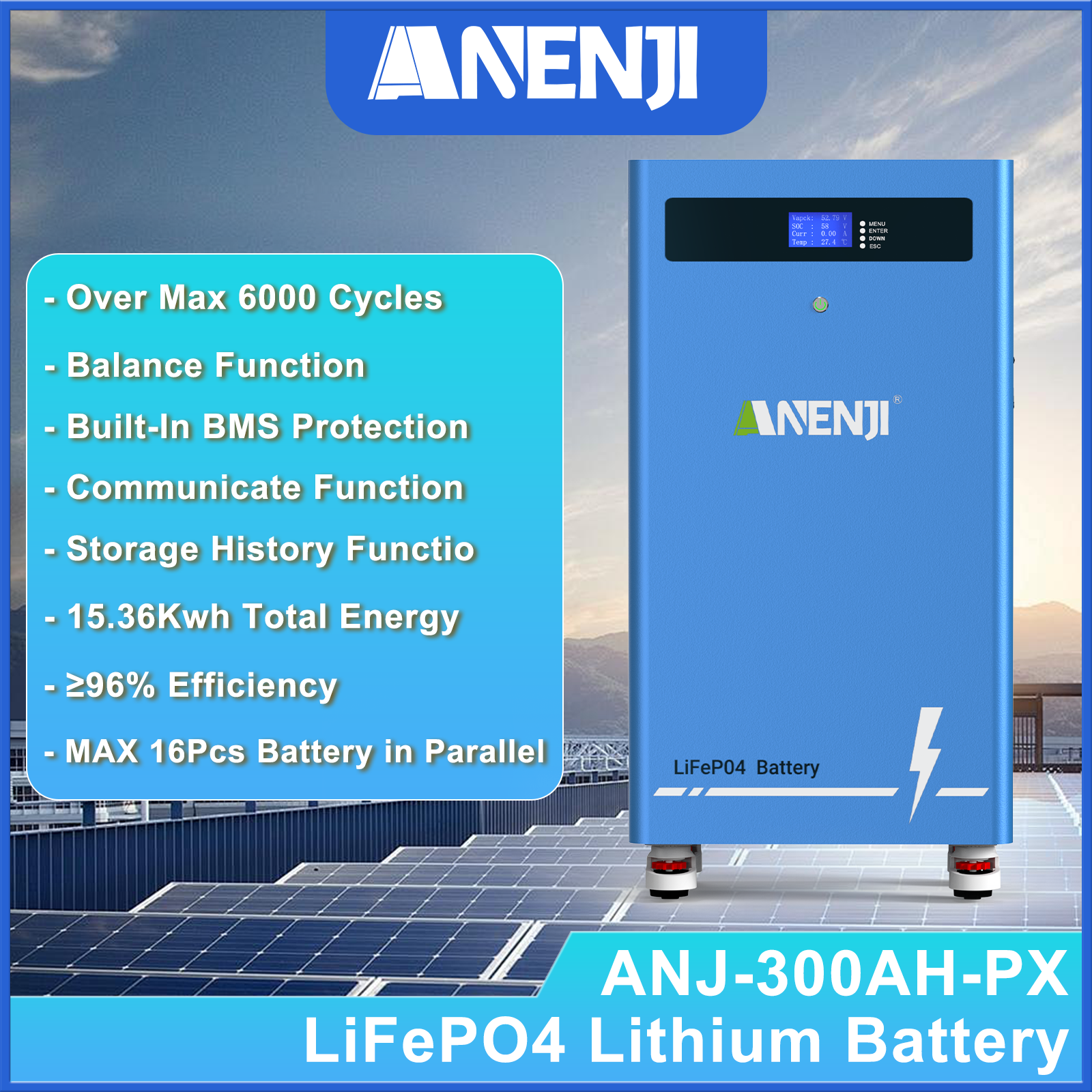 ANENJISOLAR 51.2V 300AH LiFePO4 Battery 16kWh Built-in BMS