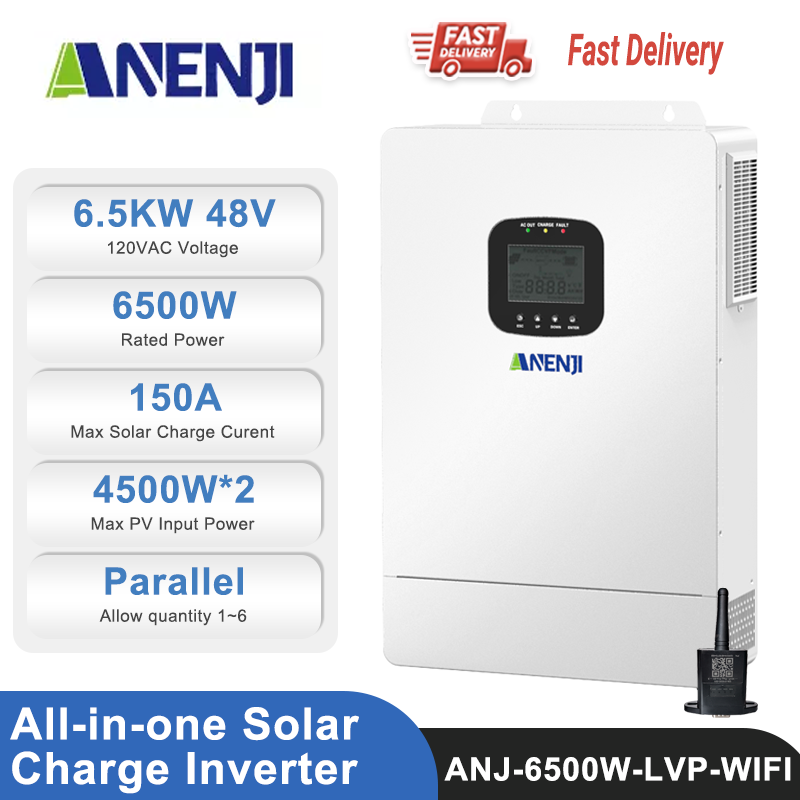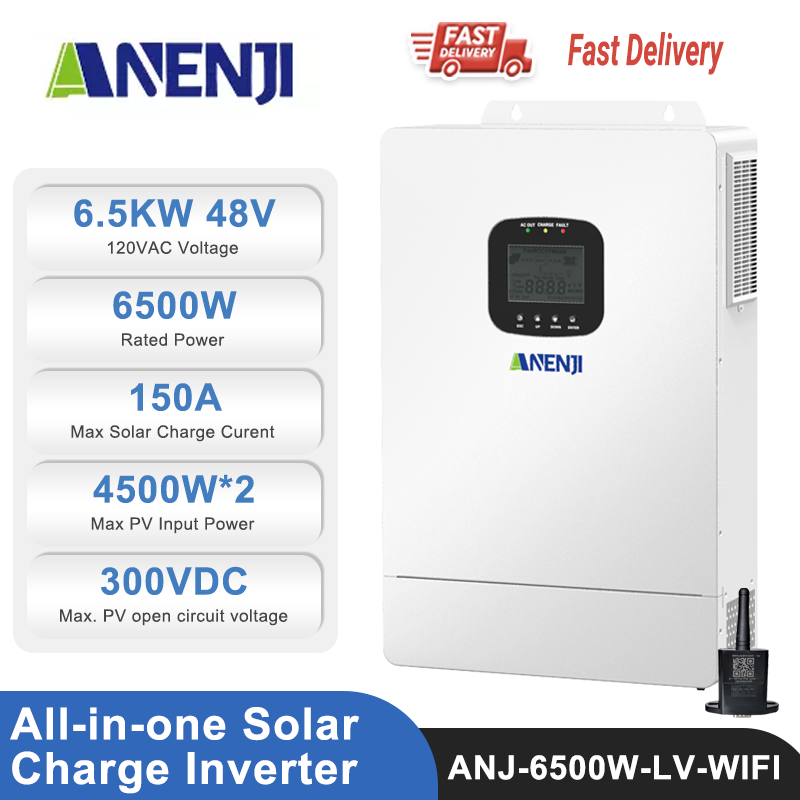 ANENJI 6500W 110Vac single-phase all-in-one solar charge inverter is a powerful and reliable choice for your energy needs. It features a built-in dual-channel MPPT and Maximum PV Input Power/Current 4500W*2/22A*2. The maximum PV open circuit voltage is 300Vdc, offering great flexibility in system design.
