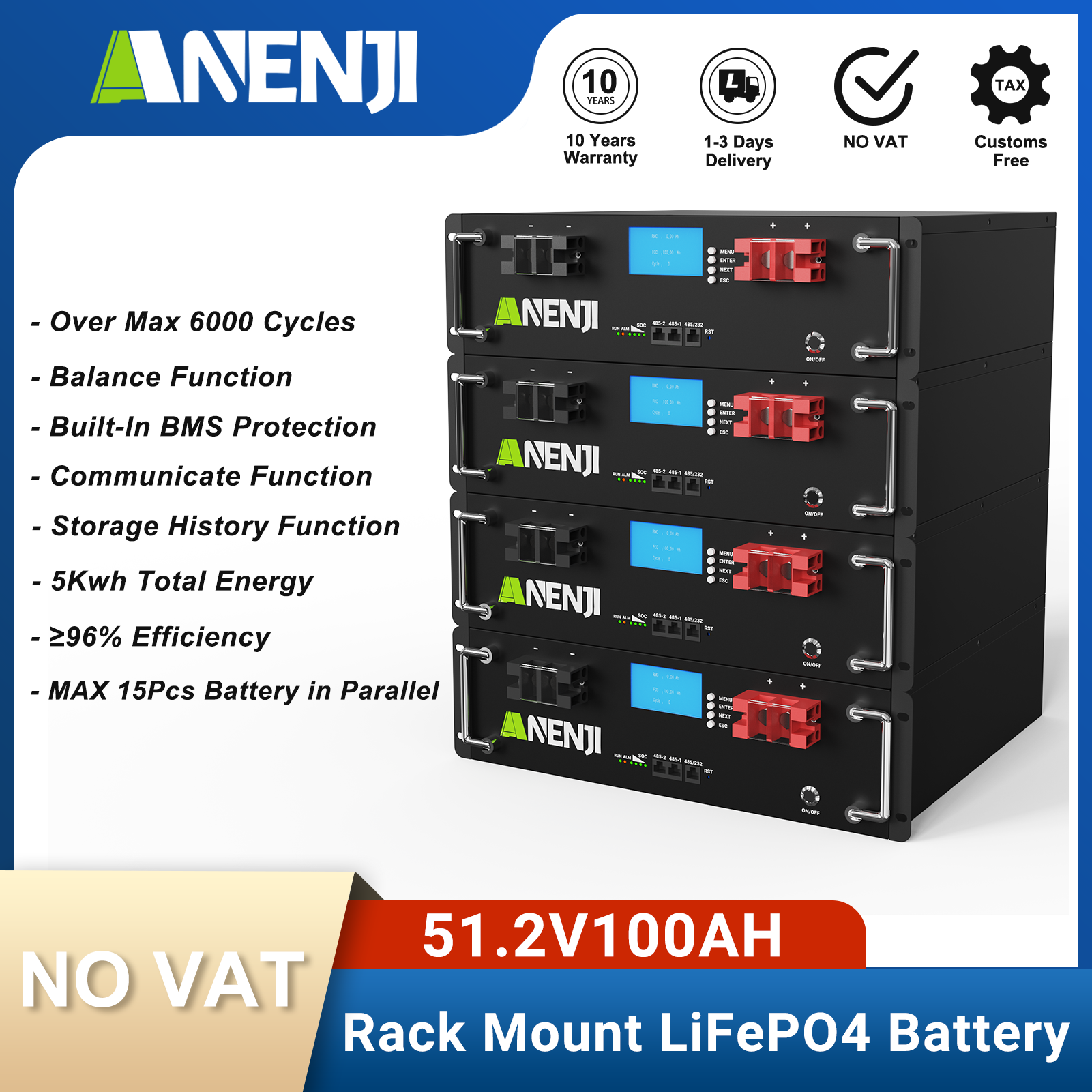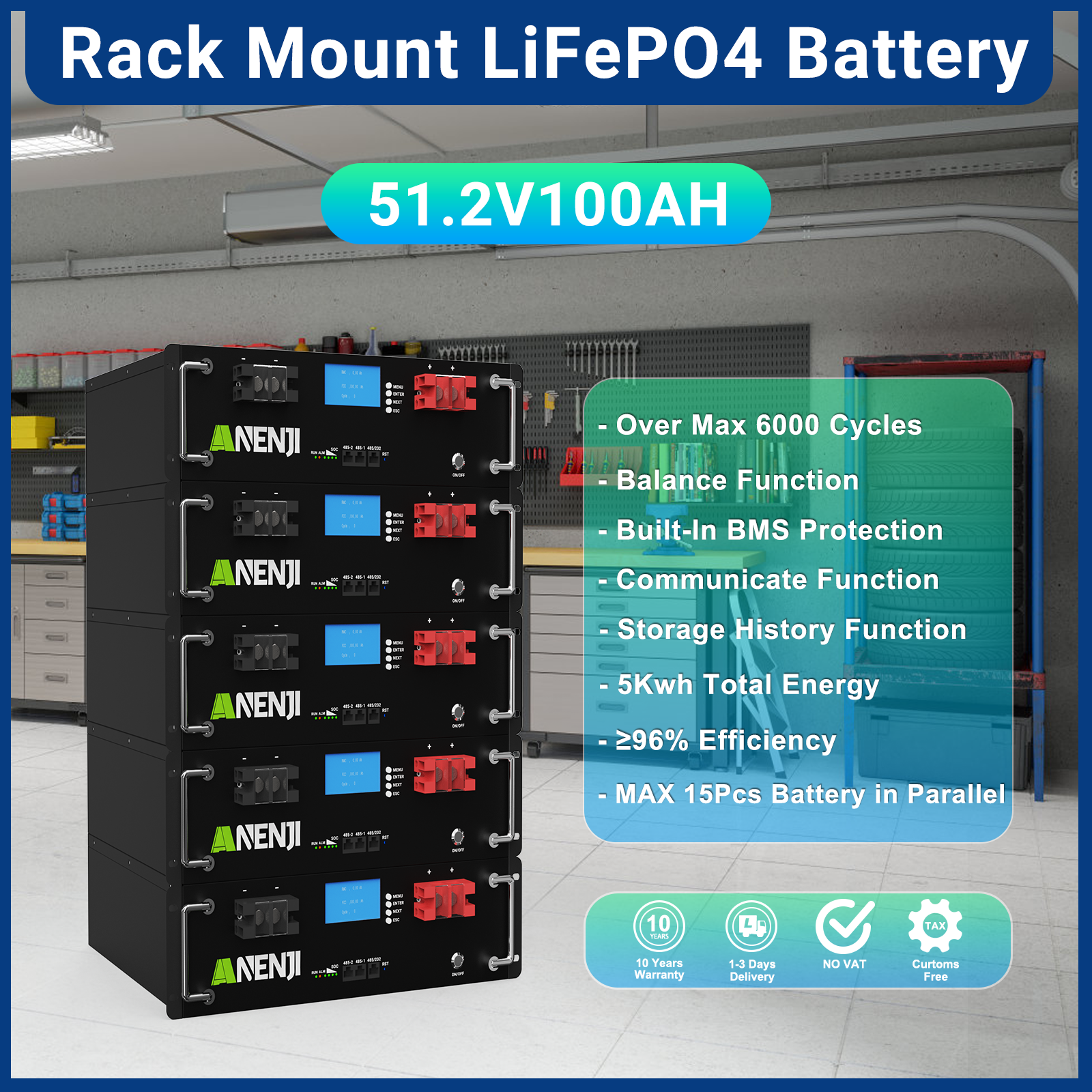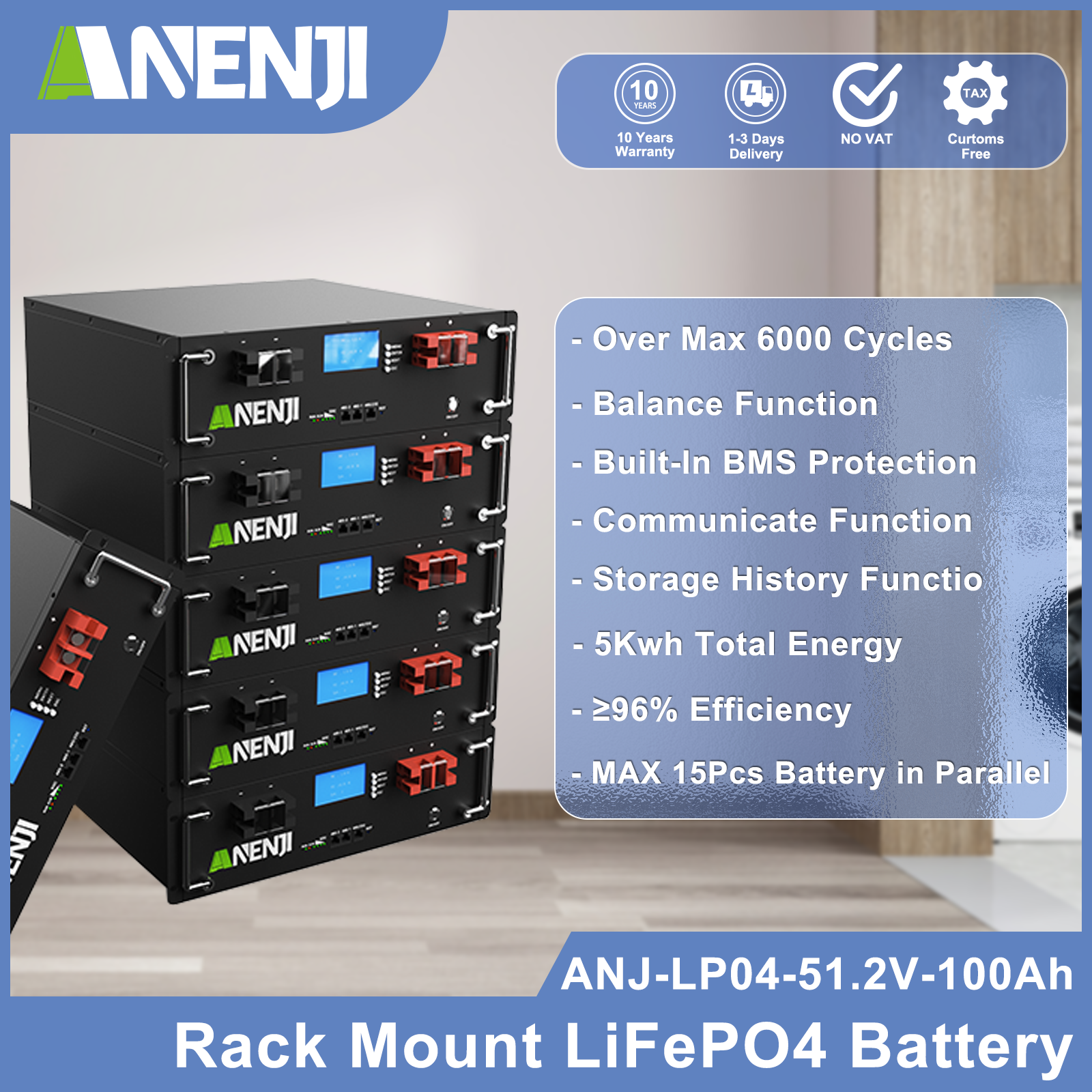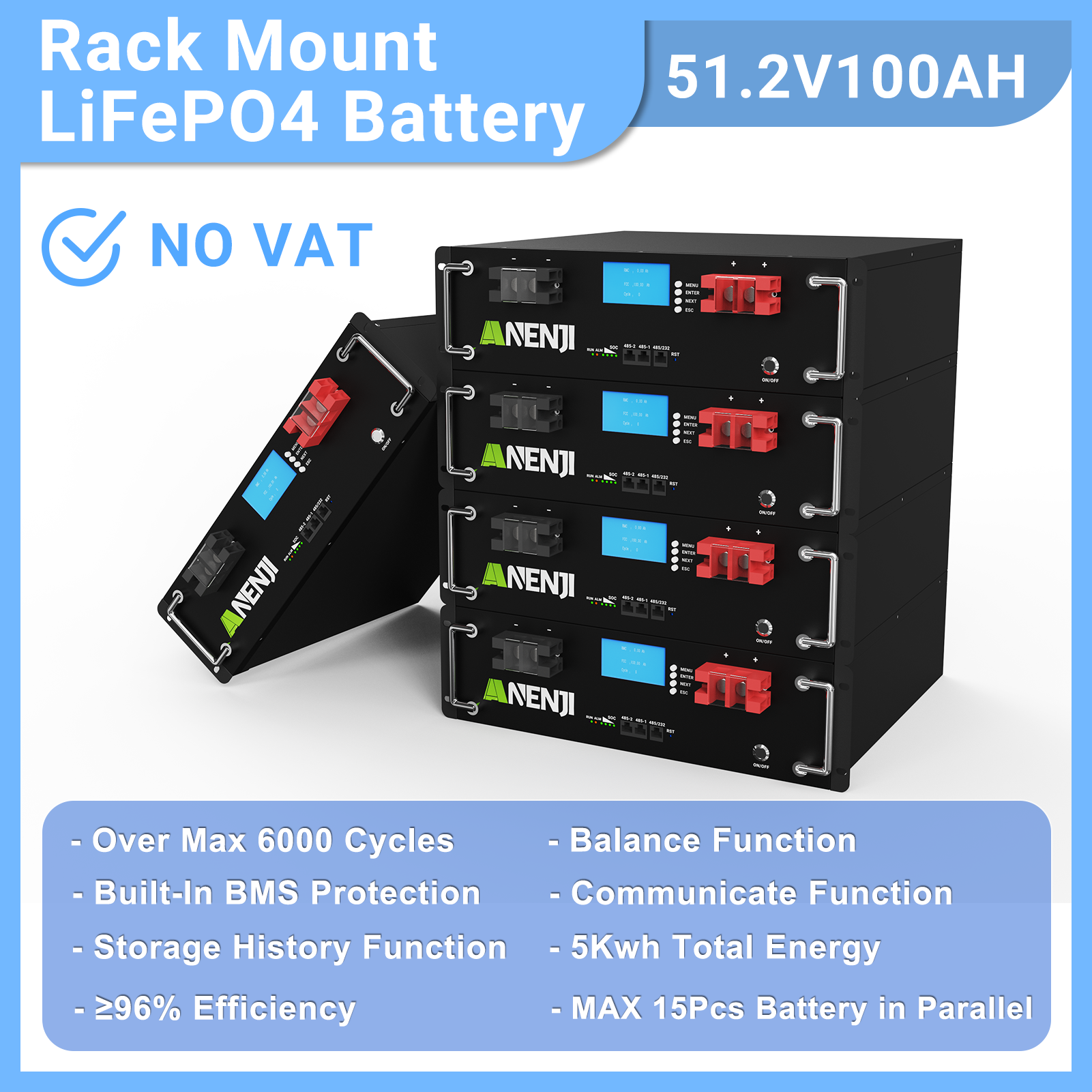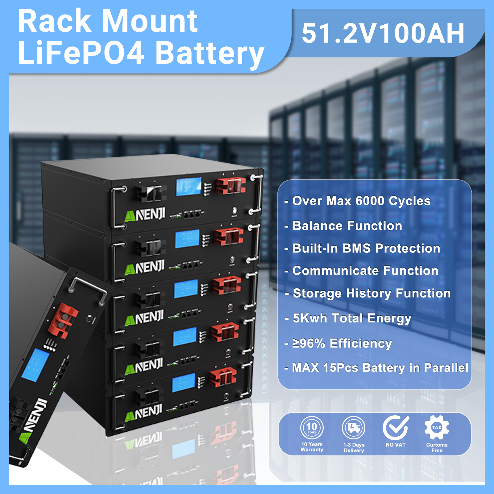 Anenjisolar51.2V 100Ah Rack-mounted LiFePO4 Battery 6000+ Cycles Built in BMS 5KWH Support Parallel for Solar System